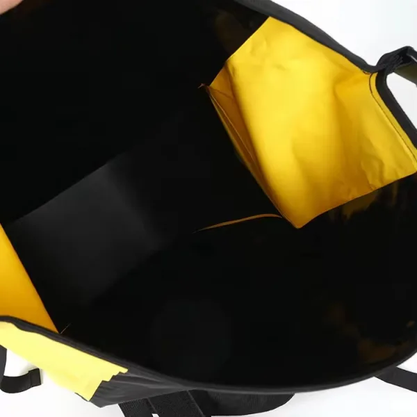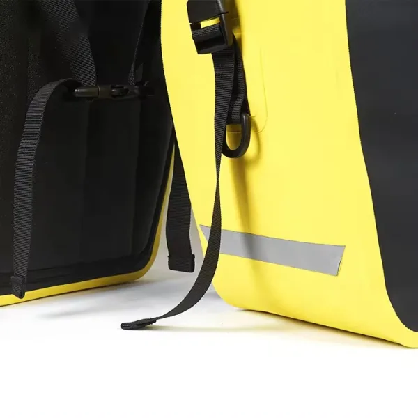 - High-Visibility Accents: The bag incorporates bright yellow panels and reflective elements designed to increase visibility in low-light conditions, enhancing safety for the cyclist on the road.