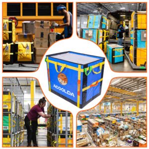 Amazon FBA Fulfillment & Warehousing Operations: This collapsible sorting sack consolidated diverse parcels for efficient routing between fulfillment stations. Its space-saving design is critical for facilities with high parcel turnover but limited empty sack storage space, enabling them to maximize fulfillment capacity. (Image_8.png demonstrates this consolidation).